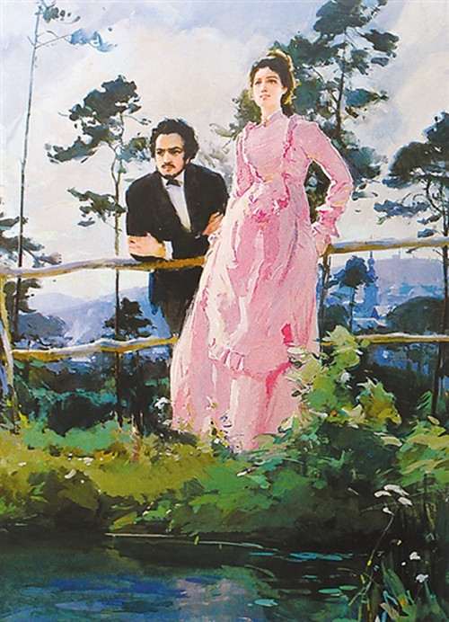 其中不乏精品。張文新的《忠貞的愛(ài)情》,發(fā)揮了畫家明亮純凈的個(gè)性語(yǔ)言風(fēng)格,與表現(xiàn)的內(nèi)容十分貼合,象征著馬克思和燕妮青春美好的愛(ài)情。張懷江的《起草<共產(chǎn)黨宣言>》,顯示了藝術(shù)家簡(jiǎn)約概括、生動(dòng)傳神的深厚功力。鄧澍的《馬克思和恩格斯在圣丹皮街皮卡爾咖啡館召開(kāi)的德國(guó)工人俱樂(lè)部會(huì)議上對(duì)工人進(jìn)行說(shuō)服教育工作》中,每一個(gè)人物的造型和神態(tài)都非常講究,畫面生動(dòng)細(xì)致,在集中引導(dǎo)向馬克思的目光下,展現(xiàn)出革命導(dǎo)師的真摯、沉著。朱乃正的《逼債》,以古典油畫的風(fēng)格,安排燕妮帶著三個(gè)孩子迎面而立,左側(cè)窗戶的側(cè)光線把母子的羸弱表現(xiàn)得淋漓盡致。