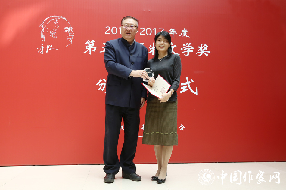 中國(guó)作協(xié)副主席高洪波為魯敏頒獎(jiǎng)