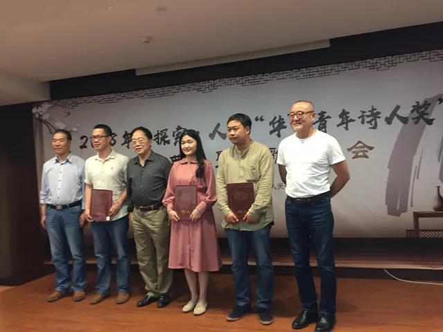 2018年華文青年詩人獎(jiǎng)的評委鄒進(jìn)、吳思敬、牛慶國為三位獲獎(jiǎng)詩人頒發(fā)證書