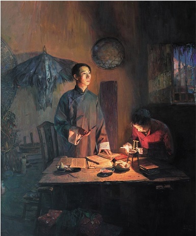 在畫面藝術(shù)表現(xiàn)上,張峻明采用了現(xiàn)實主義加浪漫主義的表現(xiàn)方式。創(chuàng)作期間,張竣明聽取了中央編譯局、中國美協(xié)、中央美院專家的建議,最終確定了陳望道站姿,頭仰望窗外,喻意東方欲曉,母親給他送來粽子,撥動火苗引喻薪火相傳,點亮信仰之火這一構(gòu)思。畫面構(gòu)思全部確定之后,就是起稿上畫布階段了,大的色彩關(guān)系一直在調(diào)整中被確定下來,細節(jié)問題逐個推敲解決。比如,陳望道的被子、枕巾等?!耙驗椴穹坷飾l件特別艱苦,白天寫字用的桌子到晚上是睡覺的床,畫面中的細節(jié)都要考慮進去?!弊鳛闅v史題材主題性創(chuàng)作,如何將作品歷史性和藝術(shù)性相統(tǒng)一,一直是張峻明努力的方向。畫《陳望道翻譯〈共產(chǎn)黨宣言〉》時,張竣明最初選擇在書房,根據(jù)查閱大量的史料,他感覺“書房”出現(xiàn)與那時候的真實背景有些不太相符,因此改為了柴房。