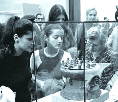 1973年,“中華人民共和國出土文物”展覽赴法國展覽,法國觀眾正在欣賞我國云南晉寧出土的西漢紡織銅貯貝器