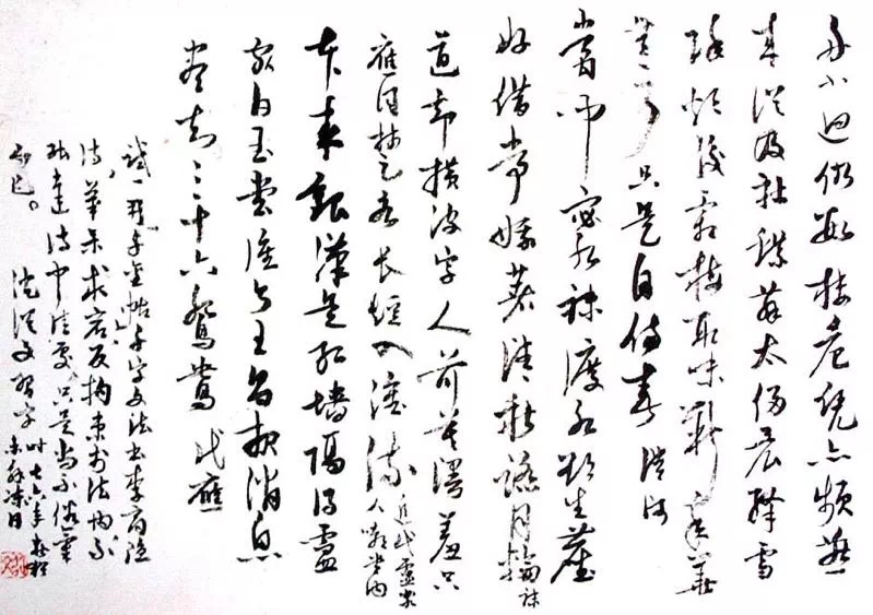 我是從老詩人曹辛之那里了解沈從文書法的。曹辛之是沈從文的好友,七十年代初,他們兩家住得不遠,常常來往。沈從文新寫了字總喜歡會拿到曹辛之家里給他看,也常把自己寫得滿意的字送給曹辛之。沈從文去世后,曹辛之發(fā)現(xiàn)自己竟有了數(shù)十張沈從文的字。
