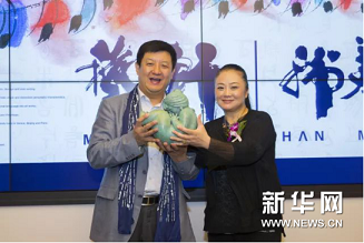 韓美林藝術(shù)館館長、韓美林藝術(shù)基金會秘書長周建萍將韓美林青銅雕塑《母與子》贈予永新華控股集團(tuán)主席李永軍