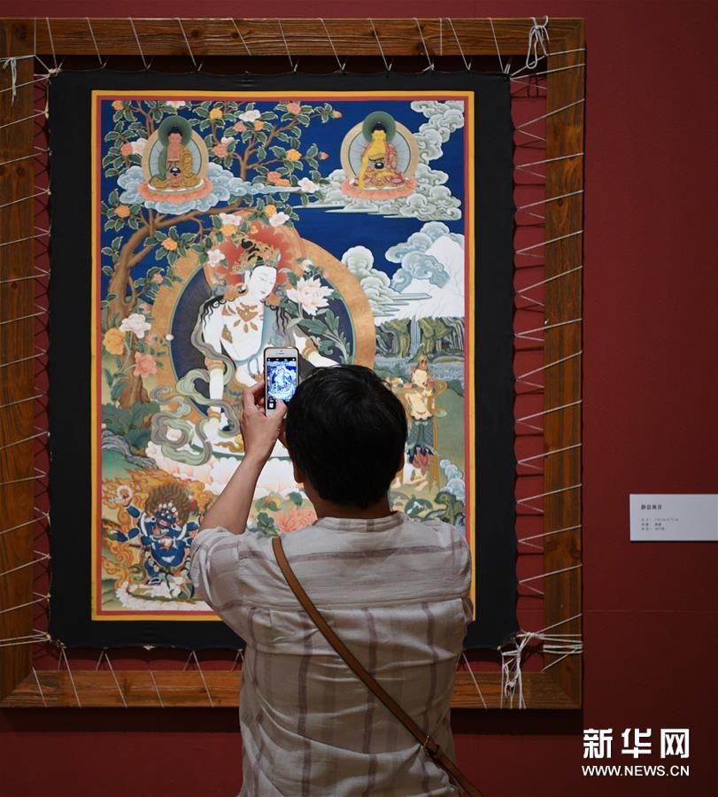 5月30日,觀眾在展覽上拍攝唐卡作品《靜息觀音》。
