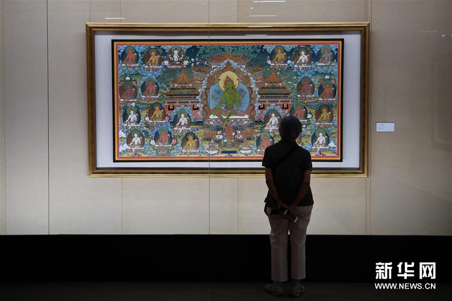 觀眾在展覽上欣賞唐卡作品《二十一度母》。