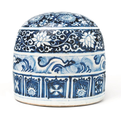 此件青花瓷“蒙古包”形器完好無(wú)損,從造型看:上半部呈半球形、下半部為圓柱體,平底,下方開(kāi)有裝飾壸門(mén)的龕式小門(mén);從裝飾看:表體施釉、白底青花為主,紋飾分五層,頂部圓心繪“穿云飛鵝”,之下依次為 “纏枝菊花”、“纏枝蓮花”、“海水卷浪”和“焰珠雜寶”。該器整體高18厘米,底部直徑18.5厘米。目前,對(duì)其時(shí)代判斷、造型詮釋、用途分析、紋飾寓意都有各種不同的理解。艾爾米塔什博物館認(rèn)為 “蒙古包”形器可能燒制于1345至1355年,胎、釉、青花料和繪畫(huà)品質(zhì)都很高,推斷是景德鎮(zhèn)為蒙元宮廷特別生產(chǎn)的;而彭濤先生則認(rèn)為,從圖案可見(jiàn),其纏枝蓮紋的蓮葉已全部是卷草紋樣式,是明初洪武的風(fēng)格。但將此器的時(shí)代推定在14世紀(jì)后半葉的范圍內(nèi)是大致沒(méi)有爭(zhēng)議的。
