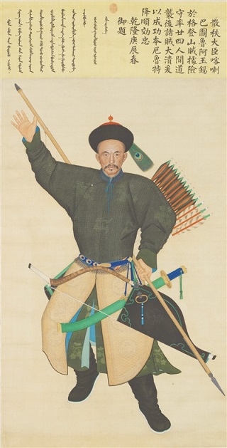 清乾隆年間,為了加強國家的統(tǒng)一,中央政府曾多次派兵平定邊疆叛亂。為了宣揚“十全武功”,每次軍隊凱旋,乾隆皇帝都要下令為征戰(zhàn)中的功臣繪制畫像,并將它們懸掛在中南海紫光閣內(nèi),計有280幅,統(tǒng)稱為“紫光閣功臣像”,天津博物館所藏《散秩大臣喀喇巴圖魯阿玉錫像》 即是其中之一。