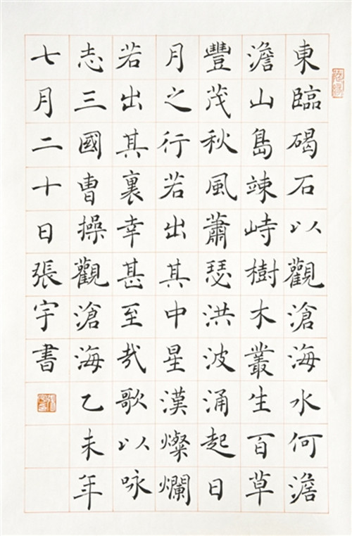 能夠把楷書寫好的人,也一定是個有溫度、有深度、有廣度的人,因為它考驗著一個人的定力和對書法藝術的理解。因此,在我看來,無論是為人處事還是為藝作文,張宇都足以成為楷則。