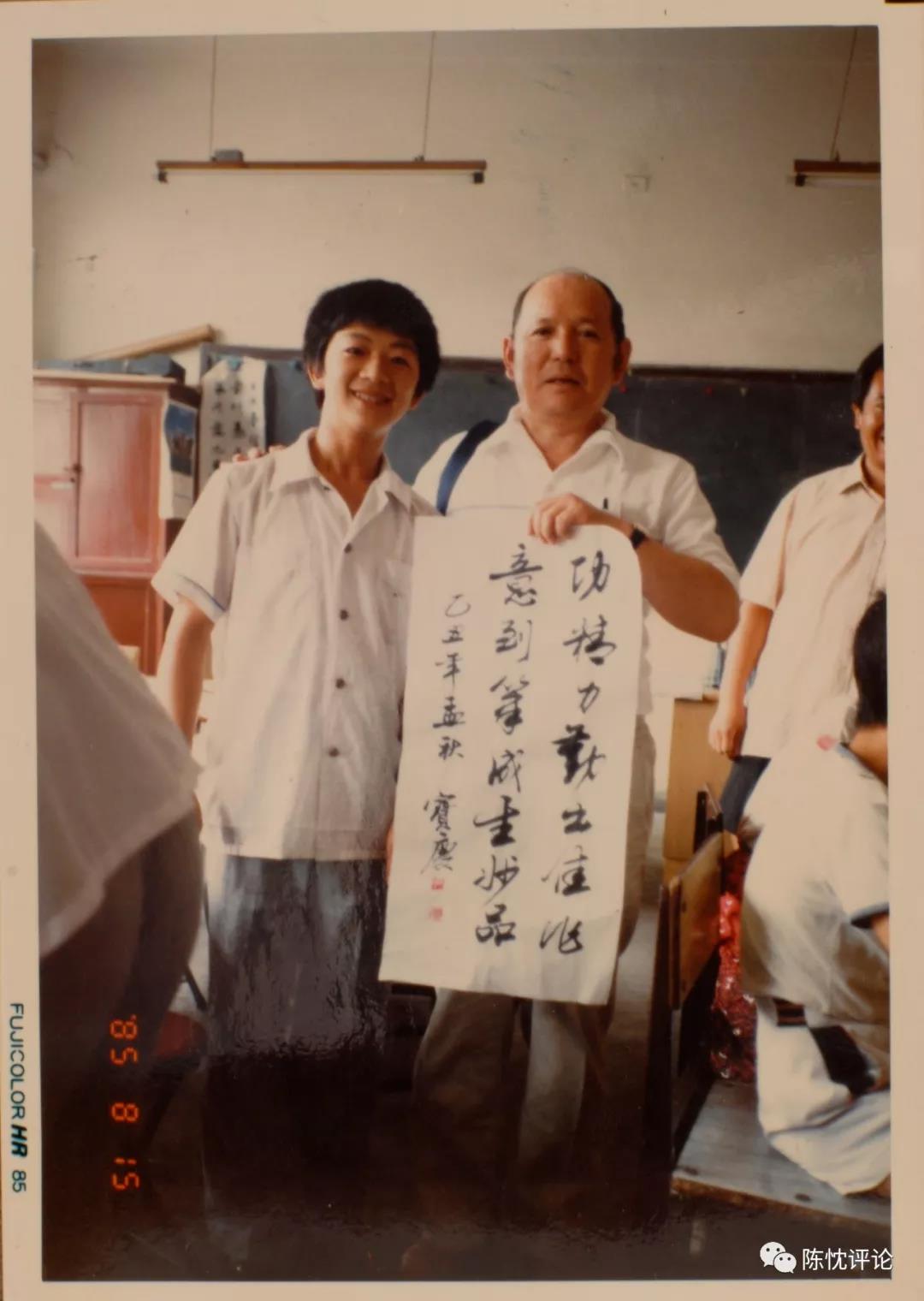 1985年郭寶慶(左)贈送日本早稻田大學(xué)友好交流訪問團書法作品