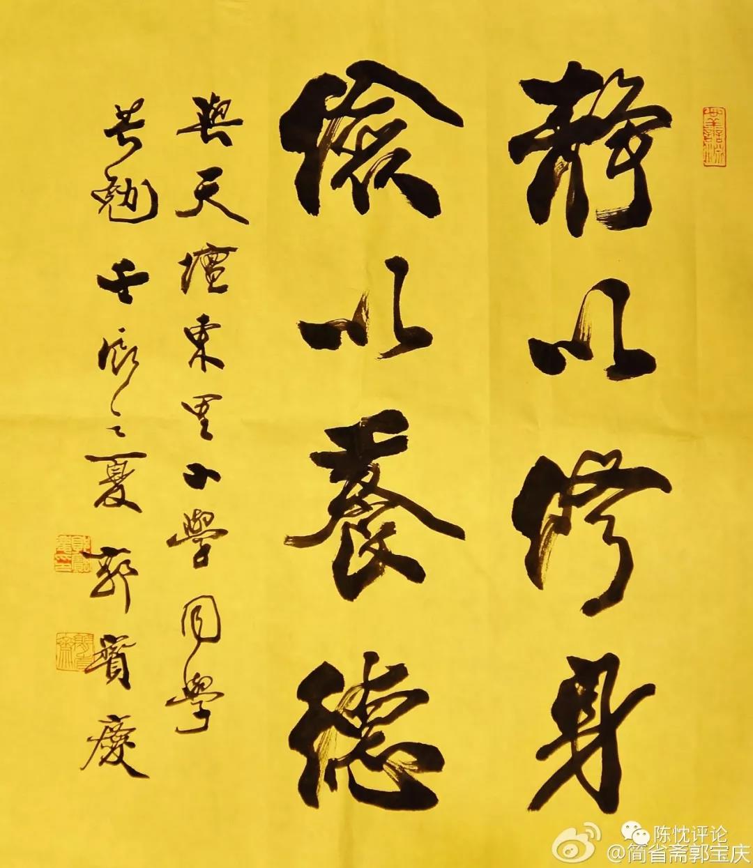 對名利的過度追求,對書畫界的有些事情,他有自己的基于“良知”的判斷,“有些書畫家一見面,就開始滔滔不絕的講,我最近書法又漲了,多少多少錢一尺”!“我是××多少多少代孫”!每次聽到這種話,郭寶慶只是笑著和對方講“能不能好好聊天?這些和你字寫的好與壞有多大關(guān)系?來,臨一段顏清臣的《多寶塔碑》和《顏勤禮碑》,沒學(xué)會走,就想跑!”