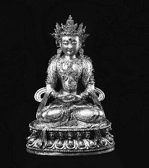 除此之外,一尊罕見漢藏宮廷風(fēng)格“十五世紀(jì) 銅鎏金嵌寶 無量壽佛”也吸引眾多藏家關(guān)注。無量壽佛是為明清兩代宮廷佛堂供奉的重點內(nèi)容,此尊無量壽佛面龐方圓,頭戴五葉花冠,頂結(jié)高發(fā)髻,耳側(cè)繒帶翻卷,耳垂圓形花珰。面容莊嚴(yán)肅穆,厚唇仍帶朱砂漆,眉心白毫鑲嵌寶石,寶石仍保存完好。本尊裝飾繁縟,工藝精細(xì),體量碩大,銅質(zhì)細(xì)密,雖然不帶刻款,但造型樣式、雕刻水平、鑄造工藝等與宮廷造像基本沒有區(qū)別,彰顯出明顯的皇家氣度。大量研究已經(jīng)表明,明代宮廷造像主要有兩種形式,分別代表兩種不同的用途:一種是刻有紀(jì)年銘文的形式,造像上刻有“大明永樂年施”或“大明宣德年施”的款識,主要用于賞賜西藏上層人士;另一種是無紀(jì)年銘文的形式,主要為宮廷佛堂或皇家寺廟供奉。此次亮相的這尊“銅鎏金嵌寶 無量壽佛”明代宮廷造像就是此種無紀(jì)年銘文的形式,它以完美的造型、精致的工藝充分顯示了它的高貴的出身——宮廷御用監(jiān)督造。