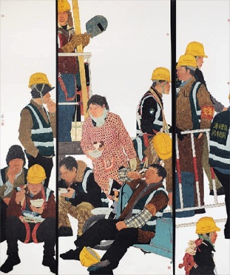 從參展作品中可以看出,青年美術(shù)家的創(chuàng)作主題很廣泛——工業(yè)、農(nóng)業(yè)、科技、軍事,以及新農(nóng)村建設(shè)等均有涉獵。比如張眾的中國畫《北京新機場·筑夢英雄志》對建設(shè)者的歌頌,作者在傳統(tǒng)繪畫表現(xiàn)語言的基礎(chǔ)上大量借鑒雕塑手法,在空間與均衡、質(zhì)感與量感的對比中烘托出了筑夢英雄的崇高之感。觀者還可以在沈曉明的中國畫《曦風(fēng)》中,看到消防官兵們?yōu)楸Wo國家人民的生命財產(chǎn)安全所做出的努力;在張靜的中國畫《中國速度》中,動車組列車帶來的是作者對國家科技騰飛的禮贊。還有很多作品是青年美術(shù)家深入基層采風(fēng)所得,比如陳留的水彩粉畫《禮贊·大地》 、周濤的中國畫《婚禮》 、馬建茂的油畫《古鎮(zhèn)余暉》等,青年人走進藏族聚居區(qū)、彝族聚居區(qū)等少數(shù)民族地區(qū)體會當(dāng)?shù)仫L(fēng)貌,走進田間地頭體驗農(nóng)桑,在他們的作品中都能看到青年人對現(xiàn)實的積極態(tài)度。