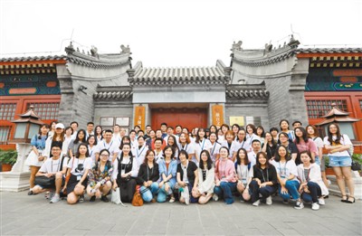首批預約觀眾和文物醫(yī)院志愿者在故宮文物醫(yī)院門前合影。 新華社記者 劉 潺攝