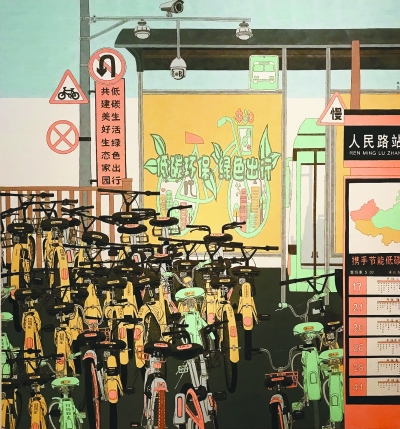 在本屆全國青年美展上,關(guān)注現(xiàn)實、扎根生活的作品讓人耳目一新,印象深刻。張眾的中國畫《北京新機場·筑夢英雄志》歌頌了機場建設(shè)者們?yōu)閭ゴ髸r代添磚加瓦的勞動精神,婁敏的綜合材料作品《新時代的勞動者》表達(dá)了作者對新型勞動者的敬意,何永興的油畫《收獲者》、曹宏倫的油畫《漁獲夕陽》傳遞著豐收的喜悅,曹文惠的《女劍客》、陳林的《鋼與泥·格斗》等油畫作品塑造了中國軍人日常訓(xùn)練或執(zhí)行任務(wù)時的英武形象,曹雁楠的連環(huán)畫《逐夢長空》之一以飛機倒懸場景展現(xiàn)了空軍飛行員的藍(lán)天英姿,沈曉明的中國畫《曦風(fēng)》生動表現(xiàn)了消防官兵們?yōu)楸Wo人民生命財產(chǎn)安全所做出的努力。除了對國家建設(shè)者和保衛(wèi)者的謳歌,參展作品還以多種多樣的形式展現(xiàn)了新時代的中國風(fēng)貌,如張靜的中國畫《中國速度》以動車組列車表達(dá)了對國家科技騰飛的禮贊,張旭的油畫《筑夢曲·四》以斑駁的色彩營造出濃郁的工業(yè)氣息,盧妙玲的漆畫《平行的世界》用紛繁復(fù)雜的平行線條切割畫面,為觀者呈現(xiàn)了現(xiàn)代化城市建設(shè)的欣欣向榮。此外,蔡曉斌的油畫《南小河邊的秦腔》、馮瑜的油畫《喜訊》、蔣露的中國畫《地鐵九號線》、陳鵬的水彩粉畫《老有所樂》等作品展現(xiàn)了普通百姓的多彩生活。趙鴻賓的中國畫《金秋暖風(fēng)送祥音》、黃華斌的中國畫《春晨》、陳流的水彩畫《禮贊·大地》等作品則是祖國大好河山的生動寫照。