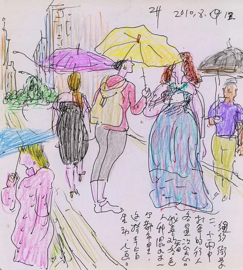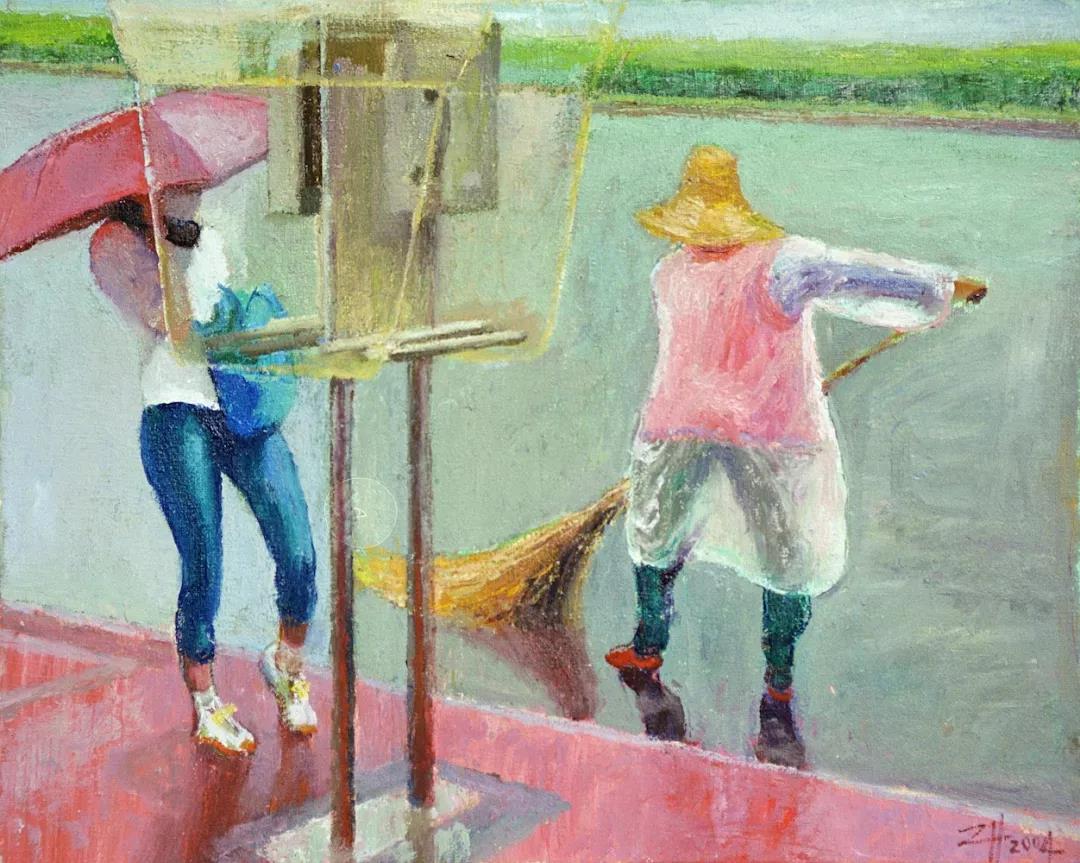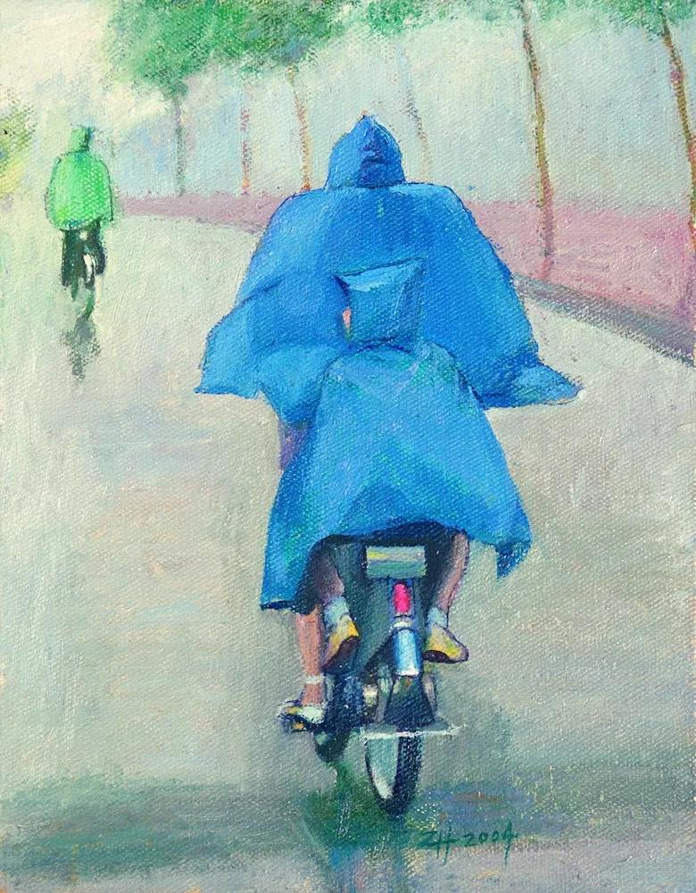 近年每逢夏天,京城的雨多雨大并不亞于南方。我畫了《今夏雨多》系列 ,分別稱作為《大雨》、《中雨》、《小雨》。雨中有共撐一把傘的戀人,有冒雨送孩子上學(xué)的母親,還有掃街的環(huán)衛(wèi)女工和電話亭沒完沒了私語的時髦女郎交集在同一雨景中。