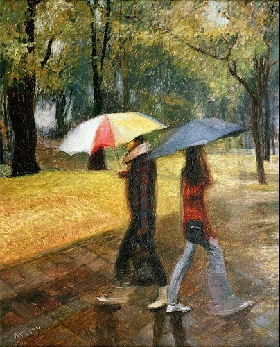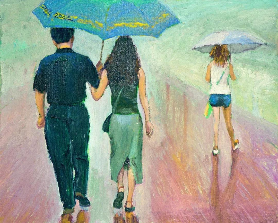 在我家的院墻外,有一片多年形成的小樹林,樹種雜而自然。那年秋天正下著雨,一場秋雨一場寒啊,一連幾天我打著傘濕著鞋站在小路邊,出神地觀察打傘的人們打這兒經(jīng)過。近在咫尺,就像是一個舞臺,臺上有男,也有女,有老也有少。他們有的是獨(dú)自一人走來,有的是成雙成對的、甚至親密相偎地經(jīng)過;而更多的路人擦肩而過,然后各奔東西。