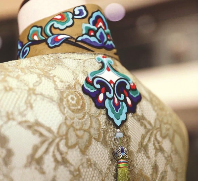 研修班結(jié)業(yè)成果,海派旗袍設(shè)計(jì)師苗海燕與唐卡技藝傳承人申支足共同完成的堆繡旗袍。(均上海公共藝術(shù)協(xié)同創(chuàng)新中心供圖)
