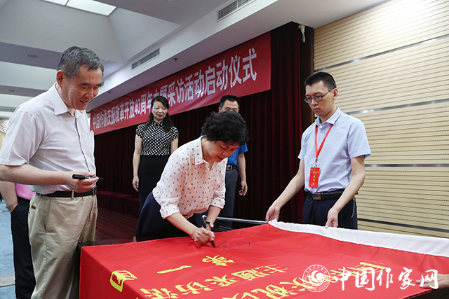 啟動儀式上,鐵凝向采訪團(tuán)第一團(tuán)授旗,采訪團(tuán)第一團(tuán)副團(tuán)長阿來接旗。鐵凝、錢小芊等與參加啟動儀式的采訪團(tuán)第一團(tuán)部分作家合影留念,并分別在采訪團(tuán)團(tuán)旗上簽名。