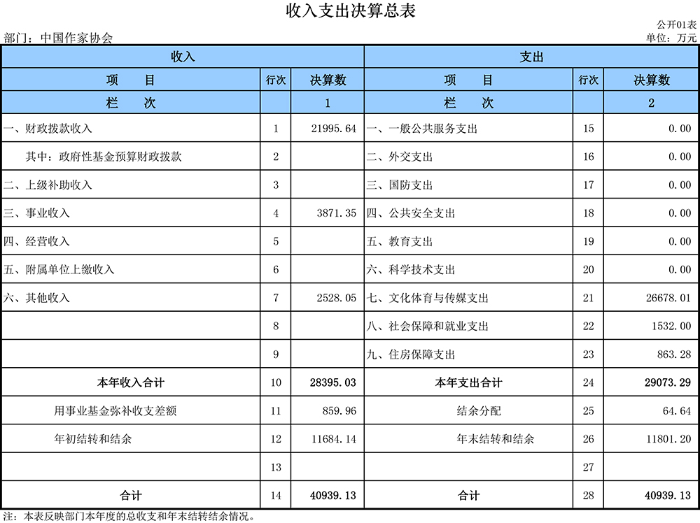 十一、文化體育與傳媒(類)文化(款)文化交流與合作(項):指中國作協(xié)本級組織作家對外交流所需的各項支出。