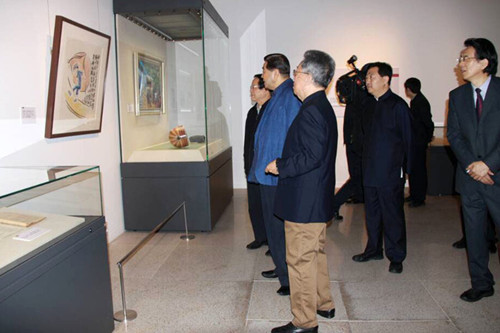王蒙和嘉賓在吉建芳的漫畫前-中國國家博物館-2014年10月