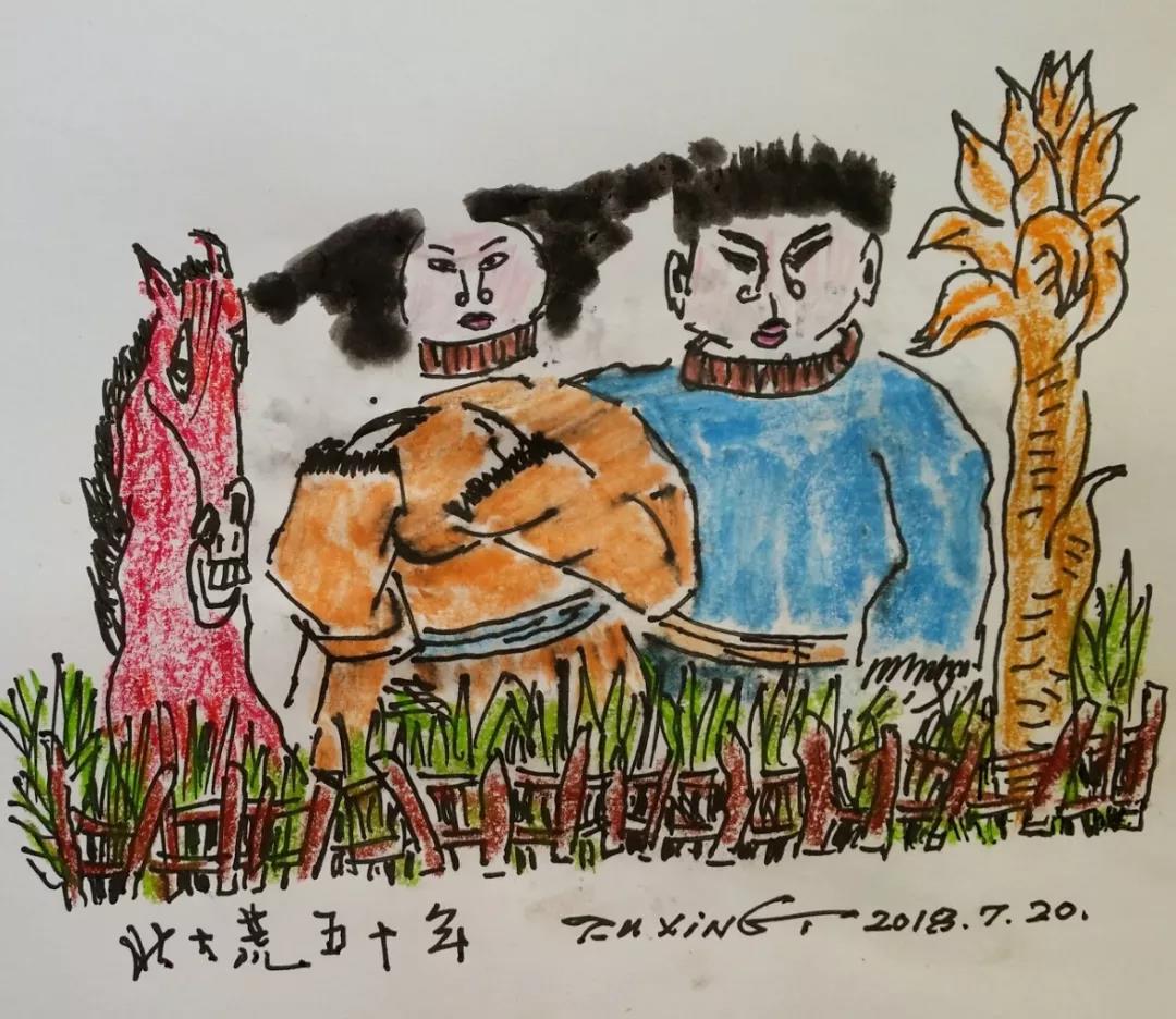 不過,大老張干活不惜力,他長得人高馬大,一膀子力氣,麥?zhǔn)斩故?,滿滿一車的麥子和豆子,他都是一個人裝車卸車,不需要幫手。需要幫手的時候,他愛叫上我。因為他愛叫我給他講故事,他最愛聽水滸。我們倆常常為爭誰坐水滸里的第一交椅而掰扯不清,我說是豹子頭林沖,他非要說是阮小二,因為阮小二是打魚的,他家祖上也是打魚的。那都是哪輩子的事了?自從他爺爺闖關(guān)東之后,他就會趕馬車。