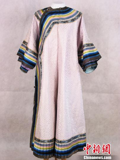 清淺藕荷綢鑲邊百摺棉袍,此袍為清宮后妃在園苑、后宮穿著的常服袍。沈陽故宮供圖