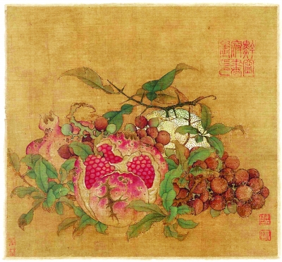 中秋美食豐富多樣,畫家筆下的花果佳肴也姿彩斐然。美國波士頓美術(shù)館藏有南宋畫家魯宗貴的《吉祥多子圖》,畫中的橘子、葡萄和石榴采用鮮艷明麗的色彩和密集的構(gòu)圖,果實(shí)在綠葉的穿插映襯下顯得格外突出,黃、紅、綠、白多種顏色絢爛多彩。橘子、葡萄和石榴都是中秋時(shí)節(jié)受歡迎的花果,在中國傳統(tǒng)風(fēng)俗中,這三種水果還具有多子多福的寓意,喜慶吉祥。