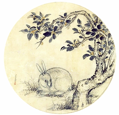 中秋之花,首推丹桂。古人仰望月空,編織出嫦娥奔月的美麗傳說。為了消解嫦娥的寂寞,又添以桂樹、玉兔的想象,使那個(gè)遙遠(yuǎn)天際的廣寒宮多了幾分人間的冷暖情味。清代乾隆時(shí)期蔣溥繪《月中桂兔圖》,以墨筆繪圓月,月中玉兔以干筆寫皮毛,焦墨點(diǎn)睛,形象生動(dòng)可愛。桂樹以墨筆繪枝、葉,筆法細(xì)膩老道。桂花以橘黃色點(diǎn)染,溫暖的色調(diào)為冷月寒宮增添了幾許暖意。全圖布局緊湊,色墨運(yùn)用巧妙,極富情趣。