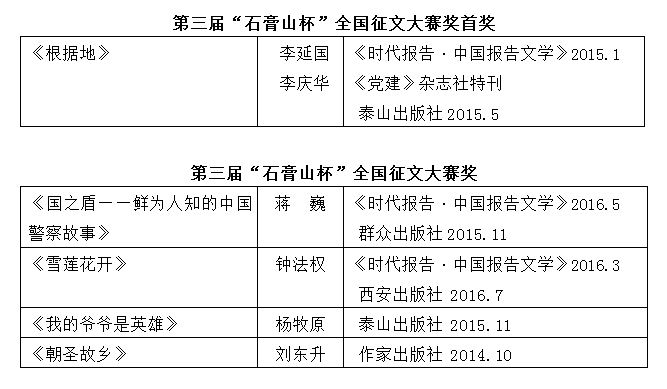 李延國、李慶華的《根據(jù)地》獲得第三屆“石膏山杯”全國征文大賽獎(jiǎng)首獎(jiǎng),獎(jiǎng)金稅前6萬元;蔣巍的《國之盾》,鐘法權(quán)的《雪蓮花開》,楊牧原的《我的爺爺是英雄》,劉東升的《朝圣故鄉(xiāng)》分別獲得第三屆“石膏山杯”全國征文大賽獎(jiǎng),獎(jiǎng)金稅前各2萬元;季志敏的《這世界不哭——廣州111號(hào)病室日記》,徐富敏的《太行山上》,張慶洲的《幸存者說:唐山警世錄續(xù)篇》,劉裕國的《你的生命之花為何如此絢爛》,牛海坤的《生命的守望者》,王少勇、陳國棟、馬亮的《地平線上的身影》,趙進(jìn)一、花葆竹的《中國又出了個(gè)“袁隆平”》分別獲得第三屆“石膏山杯”全國征文大賽獎(jiǎng)優(yōu)秀獎(jiǎng),獎(jiǎng)金稅后各1萬元。另有武國柱的《陜北“水神”》等19部作品分別獲得第三屆“石膏山杯”全國征文大賽獎(jiǎng)提名獎(jiǎng),獎(jiǎng)金各1000元。