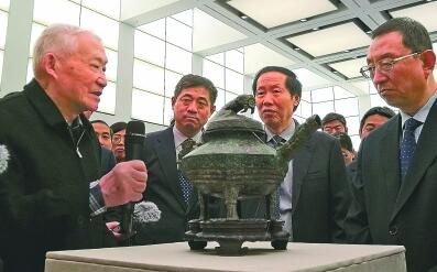 孫機(左一)向雒樹剛(右一)、劉玉珠(右二)介紹“虎瑩”的情況。本報記者 李韻攝/光明圖片