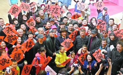 現(xiàn)場送“?!被顒映掷m(xù)了一個小時,就在領(lǐng)到福字的觀眾意猶未盡之時,中國美術(shù)館的工作人員告訴大家,北京晚報的記者還要給大家拍攝一張“全家?!薄S^眾們很快將吳為山館長、燕東升書記和藝術(shù)家們簇?fù)碓谝黄?,高舉起手中的福字,記者爬上二樓的走廊處,按下快門,拍下了這喜慶的時刻。