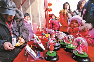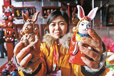 左手舉著小豬佩奇的“新版”北京面塑,右手端上兔爺造型的天津泥塑彩繪,親手磨墨、套印,嘗試制作楊柳青木版年畫,玩累了用河北蔚州的青砂器泡壺茶歇歇腳……京津冀攜手賀新春,游客逛廟會,可把三地的非物質(zhì)文化遺產(chǎn)精粹“一網(wǎng)打盡”。