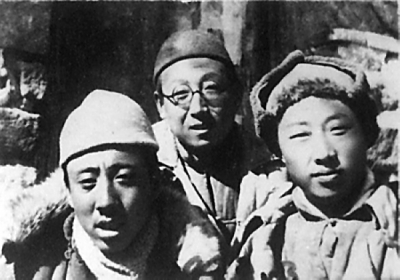 1943年3月在阜平河西村工作的孫犁(左)與胡華(右)、王煒(中)