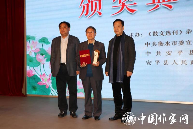 中國作協(xié)副主席李敬澤、衡水市人大主任王金剛為獲獎作家劉慶邦頒獎