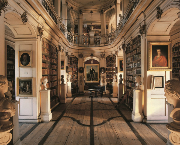 公爵的圖書館早已存在,當然,它雖然始于16世紀的魏瑪,但直到1691年才正式落成揭幕。圖書館館藏已有很好的基礎,但對文學擁有獨到品味的公爵夫人深知其不足。項目采用了最初的設計,很快便付諸實施了。建筑的中心被打開,創(chuàng)造了一個可供閱覽和保存圖書的巨大中央空間,上面是一個擺滿書架的相當大的廊臺。在大廳和城堡外墻之間,寬闊的走廊環(huán)繞著大廳,走廊兩邊都擺放有書架。圖書館的洛可可晚期風格裝飾嚴肅、簡單、迷人,而且實用。深色板條的鑲木地板看上去就像是鋪著地毯一樣。這里到處都是繪畫、裝裱的畫作和造訪此處的名人的白色大理石半身像,在整個歐洲早已聲名遠揚。迥異于那些多如牛毛的巴洛克修道院,這里是專門為愛書人創(chuàng)設的地方。