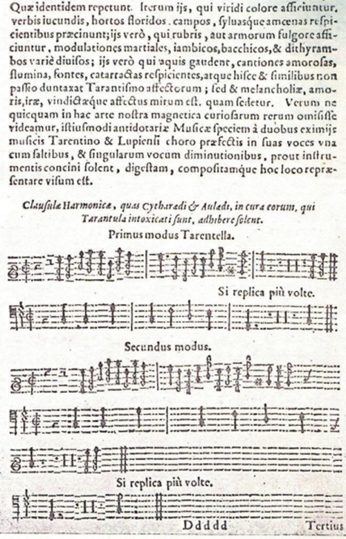 舞蹈和音樂是治療由塔蘭托毒蛛叮咬所致的瘋狂病的唯一有效藥物,但也不是任何的音樂和舞蹈都有效,只有在阿普利亞演奏了數(shù)百年的這種傳統(tǒng)音樂曲調(diào)才有效,要是沒有這舞蹈和音樂,病人會在幾小時或者幾天內(nèi)死去。就這樣,他們常常太陽一升起就開始跳,持續(xù)不斷地跳到午前十一時。但也有些人會在中途停下,這并非是因為跳得過于疲憊不堪才不得不休息,而是因為發(fā)現(xiàn)舞蹈的節(jié)拍跟不上曲調(diào)。如此這般,大約跳到正午,他們才停息下來,躺到床上去盡情出汗,然后擦干身上的汗,喝點兒肉湯補(bǔ)充營養(yǎng)。大約下午一點,最遲兩點,舞樂又開始了,人們一直跳到晚上。這樣一連數(shù)日,病人精疲力竭了,病也就暫時治好了。據(jù)說有一些人,大部分是陷入愛情之中或者感到孤獨寂寞的人,為了加入跳舞的行列,甚至假裝發(fā)病。這些人大多是戀愛中的女子和單身漢,希望在這舞蹈意淫中獲得性的滿足。