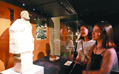 觀眾在清華大學(xué)藝術(shù)博物館參觀阿富汗國(guó)家寶藏展上展出的“赫爾墨斯方形石柱”。新華社發(fā)