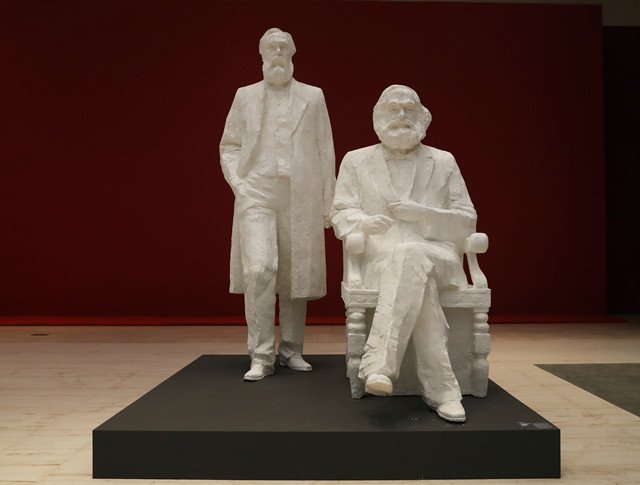 這尊雕像后面是石膏像《偉大的友誼——馬克思、恩格斯》,恩格斯是馬克思的摯友,也是名副其實的第二小提琴手,他的父親是位富商,家境殷實,馬克思一家在倫敦窮途潦倒時,恩格斯為了馬克思的事業(yè)提供了很多無私的經濟支持。