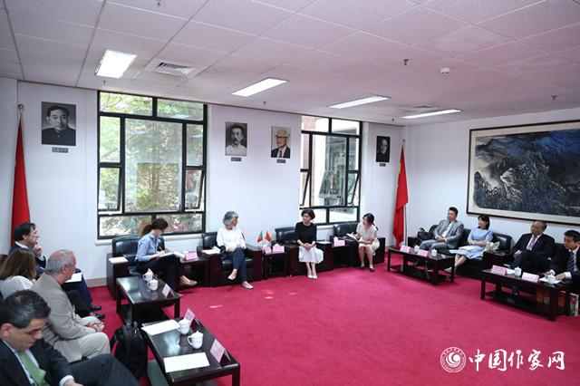 論壇開(kāi)幕前,中國(guó)作家協(xié)會(huì)主席鐵凝與葡萄牙文化部長(zhǎng)豐塞卡親切會(huì)談,中葡兩國(guó)作家代表參加會(huì)談