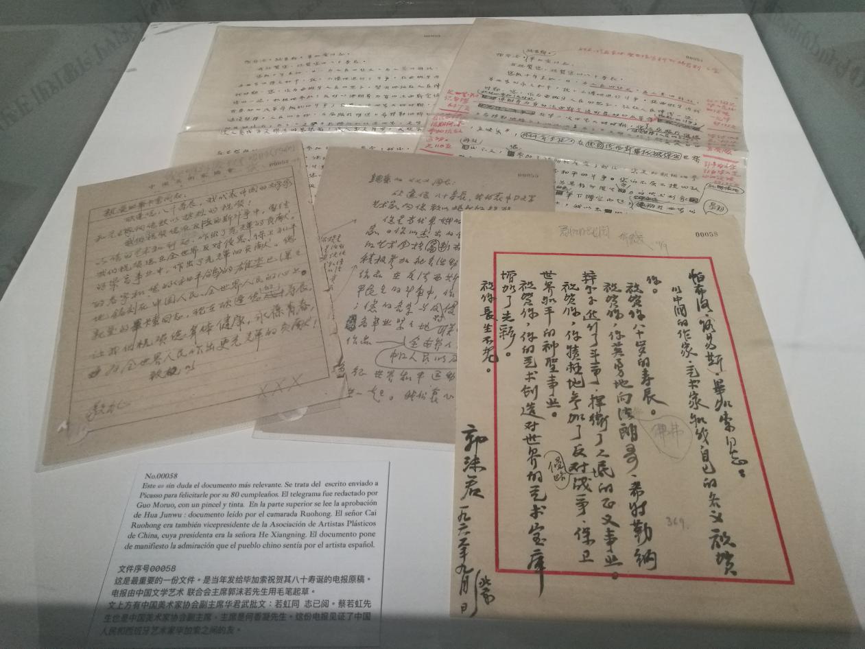 展覽中還有一件特殊的未曾發(fā)表過的展品: 詩人郭沫若在1961年代表中國政府為祝賀畢加索80壽辰而起草的賀電手稿原件。這份手稿表現(xiàn)出了中國對這位馬拉加天才的與尊重,同時(shí)也見證了中國人民和畢加索之間的友誼。手稿原件由收藏家李志遠(yuǎn)提供,除原稿之外,還包括定稿之前數(shù)個(gè)版本的修改稿。畢加索與中國之間的吸引是雙向的。這位安達(dá)盧西亞畫家深深被中國書法的抽象意境、自由筆觸和簡潔之美所吸引,沉醉在紙與墨的詩意對話中,他為此對克勞德·羅伊說出了那句著名的話:“如果我出生在中國,我就不會(huì)成為畫家而是書法家了,我會(huì)寫我的畫?!碑吋铀髟?956年曾見過畫家張仃,十年后又在法國戛納見到張大千,他曾多次對他們表明自己是中國藝術(shù)表現(xiàn)力和包容性的崇拜者。