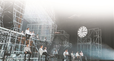 “在舞臺上,你們會看見巨大的一個環(huán)形裝置。實際上,這部劇的整個時間表達(dá)也是環(huán)形的?!眳涡浇庾x了舞臺裝置的象征意味:在這樣一個環(huán)形的一天天重復(fù)的偶然的世界里面,我們才會真正地發(fā)現(xiàn)人類的悲劇。