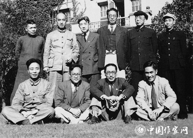 1949年9月,全國(guó)政協(xié)會(huì)議期間文藝界代表合影,前排左起:艾青、巴金、史東山、馬思聰;后排左起:曹靖華、胡風(fēng)、徐悲鴻、鄭振鐸、田漢、茅盾