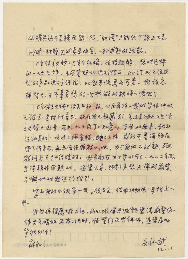 《立體交叉橋》決定且放一放,以后再改。我的寫作沖動,已被另一素材所牽引,現(xiàn)在我已預感到,寫出來將與《立體交叉橋》迥異,而且,也不同于《如意》;寫作對我來說,猶如運動員的一次次上陣競技,既已上陣,成敗可置諸腦后,只待下陣來后,再總結(jié)經(jīng)驗教訓吧!由于我的不成熟,當然,教訓總是多于經(jīng)驗的。我爭取在四十歲以后(1982年后),變得稍許成熟些。還望大家,特別是您這樣的前輩,不懈地對我進行指引。