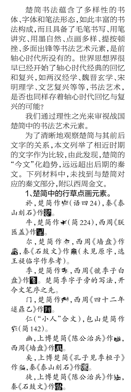戰(zhàn)國楚簡,是當前出土最多的軸心時代經(jīng)典文獻,其簡書墨跡中顯現(xiàn)了隸變的發(fā)端。從楚簡文字的“今文”化、多元性書法元素來看,楚簡“經(jīng)典書變”的方向并非限于“隸定”,下面以楚簡為例論述。