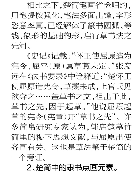 關(guān)于楚簡文字,郭沫若先生認為:“體式簡略,形態(tài)扁平,接近于后代的隸書?!濒缅a圭先生也認為:“如果秦沒有統(tǒng)一全國,六國文字的俗體遲早也會演變成類似隸書的新字體的。”饒宗頤先生也有相同的觀點。思想經(jīng)典的抄寫,啟迪了書寫者的自由意志和人性發(fā)微,產(chǎn)生了多樣的筆法、墨法、章法形態(tài),具備了后來草、隸、行、楷多種字體的筆法和結(jié)構(gòu)。