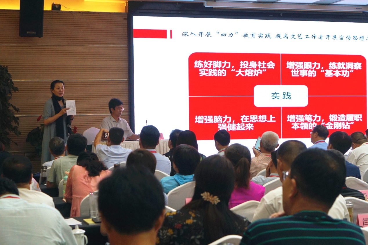 培訓(xùn)期間,李彬以《深入開展“四力”教育實(shí)踐 努力打造文藝工作者開展思想政治工作的過硬素質(zhì)》為題進(jìn)行專題授課,從重視文藝宣傳工作是我們黨一以貫之的優(yōu)良傳統(tǒng)、增強(qiáng)“四力”是新時(shí)代對(duì)增強(qiáng)思想政治工作的熱切呼喚、新時(shí)代增強(qiáng)“四力”的本質(zhì)要求、新時(shí)代增強(qiáng)“四力”的路徑四方面進(jìn)行講解,深入淺出地分析,鼓勵(lì)學(xué)員們“走下去,到人民群眾中,去發(fā)現(xiàn)問題”,提出“經(jīng)過反思、思考、組織、提煉、分析、辨別、發(fā)現(xiàn)問題,然后再拿出解決問題的辦法這一過程,就是踐行‘四力’的過程”。