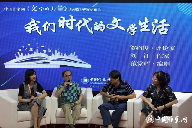 8月24日上午,由中國作家網(wǎng)策劃拍攝的系列短視頻《文學的力量》在第26屆北京圖博會“中國作家館”舉行發(fā)布會,并邀請評論家賀紹俊、作家劉汀和編劇范黨輝圍繞“我們時代的文學生活”進行對話,從新穎獨特的角度展示新中國文學的發(fā)展,探討當下文學現(xiàn)場,引起媒體和讀者濃厚的興趣。發(fā)布會由中國作家網(wǎng)副總編輯王婉主持。