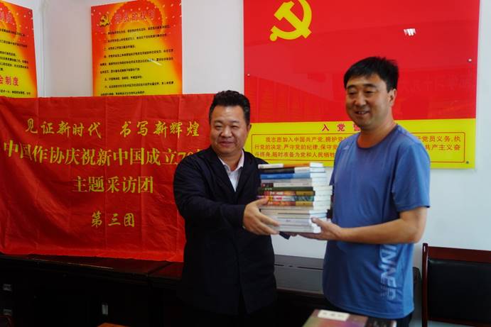 座談會結(jié)束后,邱華棟向池溝村捐贈采訪團成員創(chuàng)作和簽名的作品。同時,采訪團作家在采訪團旗幟上鄭重簽名留念。
