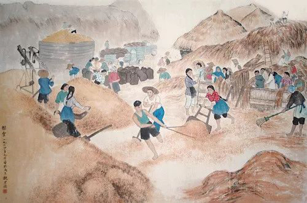 從耕種土地不足到開墾荒地、圍湖造田,從春播夏種到罱河泥積肥,從收割到拾穗,粒粒皆辛苦,每一個時節(jié)都與汗水和辛勞相連。臉朝黃土背朝天,年復一年,春夏秋冬,這就是農(nóng)民生活最核心的內(nèi)容。從延安到新中國以來,美術(shù)家們一代接著一代表現(xiàn)自己所熟悉的農(nóng)村以及農(nóng)業(yè)和農(nóng)民,這些時代的畫卷不僅構(gòu)成了新中國農(nóng)業(yè)發(fā)展的歷史,而且也表現(xiàn)了農(nóng)民在這個時代中發(fā)生的巨大變化。無疑,“豐收”是每個時代主題中的主題。