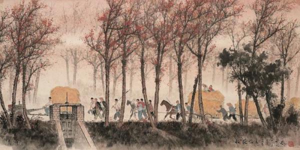 進入70年代,魏紫熙表現(xiàn)豐收主題的作品離開了他慣常的曬場,1971年創(chuàng)作的《收獲歸來》則把收獲歸來的空間放到了河堤之上,呈現(xiàn)了一個不一樣的“遍地英雄下夕煙”的情景。該畫完全沒有那個時代中的特點,沒有紅旗和標語,也沒有那個時代中常見的許多符號,可是,表現(xiàn)人民公社的秋收卻是非常平實的鄉(xiāng)村中的一種特別的自然景象。畫面前方的左邊有一個水閘,表明了它是在河堤這樣一個特殊的環(huán)境之中。河堤邊上秋天的紅葉樹林營造了整體的秋天氛圍。在這平直的河堤上,前面是拖拉機,后面是馬車,都是滿載的收獲。知識青年不管是開拖拉機,還是幫著拉板車,他們在收獲歸來的路上滿載著喜悅的心情。這里以“歸”為契機,離開了田地,離開了收割,也離開了汗水,而是在歸程的路上,因此,歸來的心情與正在勞動的狀態(tài)完全不同。知識青年在農(nóng)村這一“廣闊天地”之中,在鍛煉中成長,大有作為,正如同收獲的今天一樣,是一種不同于往日的特別的心情。毫無疑問,這是一個特殊年代中的景觀,但是,魏紫熙在處理“豐收”題材,在處理人物關系以及知識青年和農(nóng)民之間的關系等,都成為這個時代中的一件非常重要的作品。